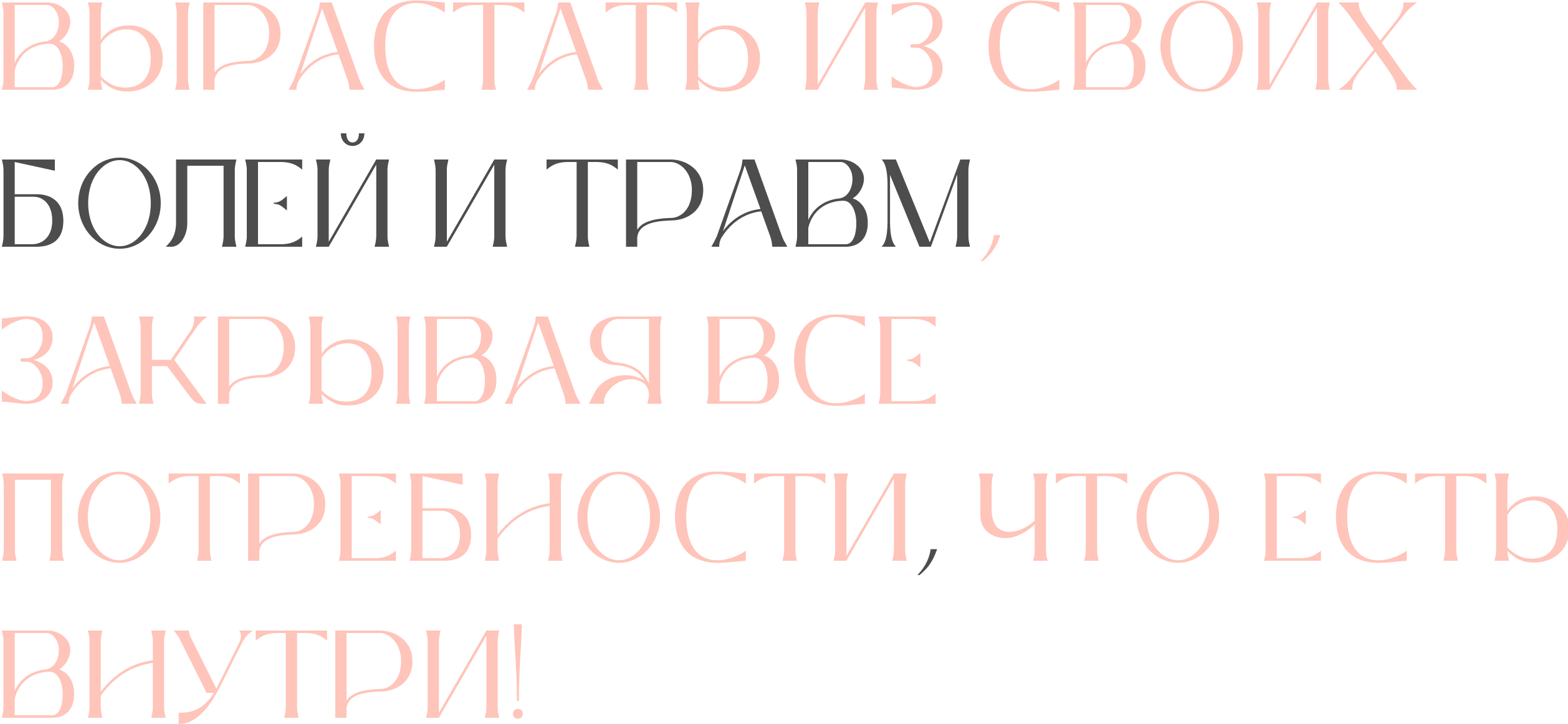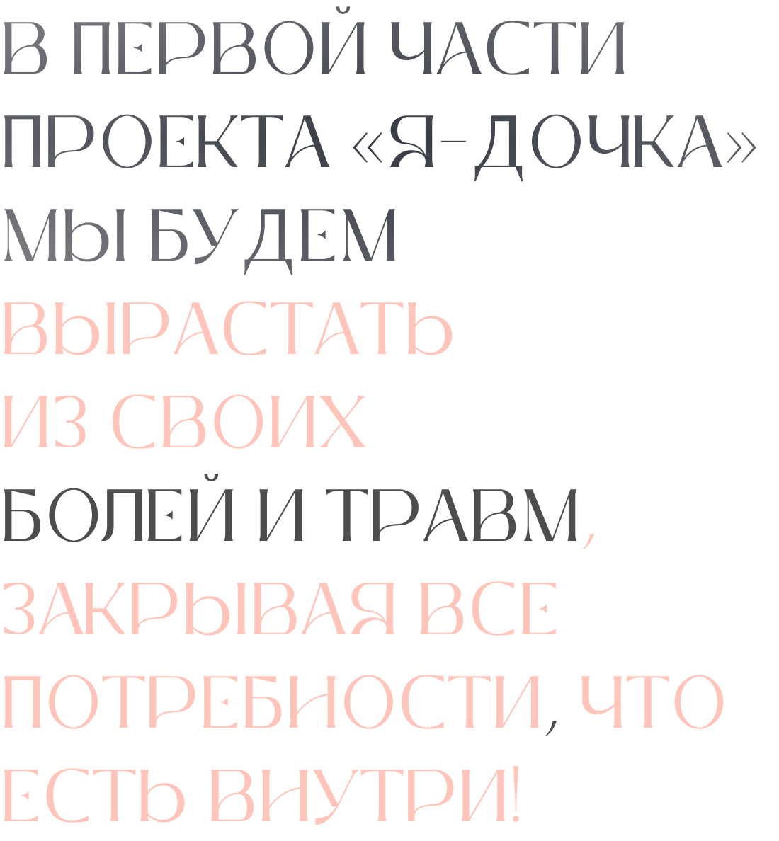 В первой части проекта мы будем бережно доращивать себя, закрывая все потребности внутри, будем сепарироваться от мамы, вырастая из своих болей и травм, чтобы, наконец, управлять своей жизнью не из детского опыта, а из наших желаний и реальности.